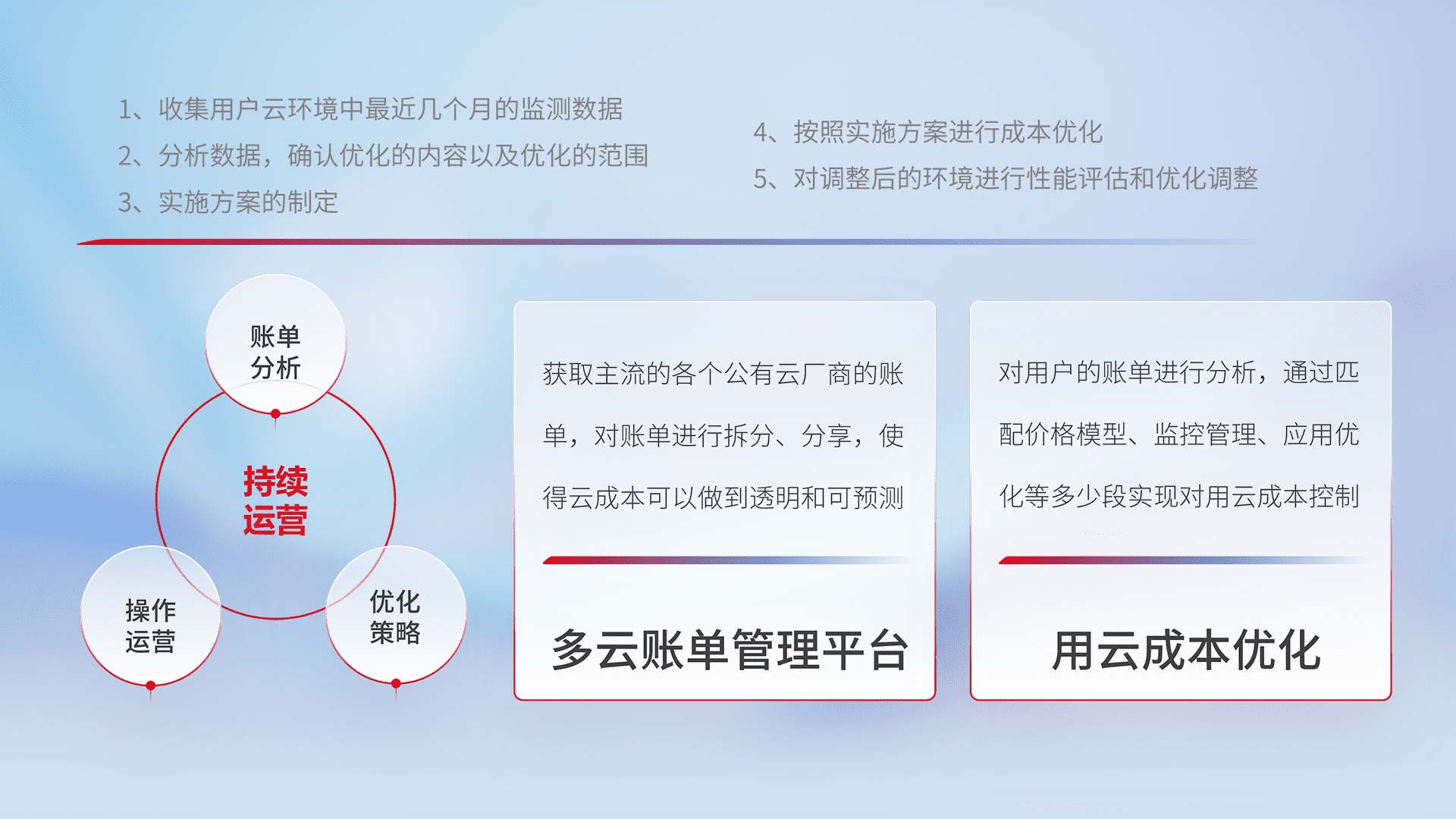 通过多云纳管,,,以统一的资源数据模型把客户的云资源进行抽象和封装,,进而实现对多云资源的统一操作,,,,保障云资源管理的可靠性、、、稳定性与可用性。。量身定制化运维内容,,,配置、、、开发运维、、、、补丁管理、、备份、、监控、、、认证和访问管理、、、、审计和日常巡检等,,保障在用云过程中的可靠度,,,稳定度以及高可用率。。。。